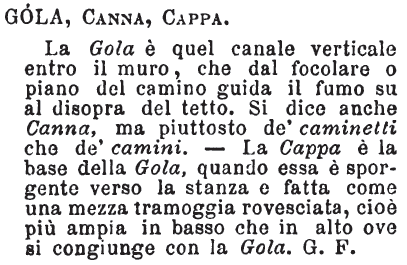 | Gola, Canna, Cappa - La Gola è quel canale verticale entro il muro, che dal focolare o piano del camino guida il fumo su al disopra del tetto. Si dice anche Canna, ma piuttosto de' caminetti che de' camini. - La Cappa è la base della Gola, quando essa è sporgente verso la stanza e fatta come una mezza tramoggia rovesciata, cioè più ampia in basso che in alto ove si congiunge con la Gola. G. F. [immagine] |