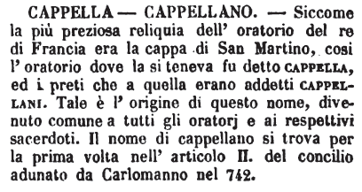 | Cappella, Cappellano - Siccome la più preziosa reliquia dell'oratorio del re di Francia era la cappa di San Martino, così l'oratorio dove la si teneva fu detto cappella, ed i preti che a quella erano addetti cappellani. Tale è l'origine di questo nome, divenuto comune a tutti gli oratorj e ai rispettivi sacerdoti. Il nome di cappellano si trova per la prima volta nell'articolo II. del concilio adunato da Carlomanno nel 742. [immagine] |