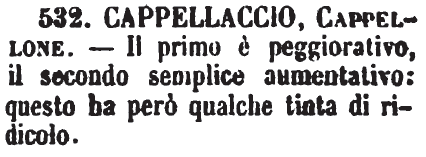| Cappellaccio, Cappellone - Il primo è peggiorativo, il secondo semplice aumentativo: questo ha però qualche tinta di ridicolo. [immagine] |