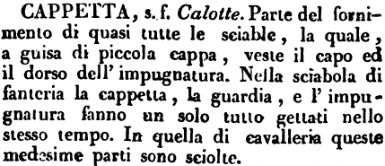 | Cappetta - s. f. Calotte. Parte del fornimento di quasi tutte le sciable, la quale, a guisa di piccola cappa, veste il capo ed il dorso dell'impugnatura. Nella sciabola di fanteria la cappetta, la guardia, e l'impugnatura fanno un solo tutto gettati nello stesso tempo. In quella di cavalleria queste medesime parti sono sciolte. [immagine] |