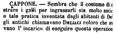 | Cappone - Sembra che il costume di castrare i galli per ingrassarli sia molto antico e tale pratica inventata dagli abitanti di Delo gli antichi chiamavano deliaci coloro che avevano l'incarico di eseguire questa operazione. [immagine] |