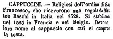 | Cappuccini - Religiosi dell'ordine di San Francesco, che riceverono una regola da Matteo Baschi in Italia nel 1528. Si stabilirono nel 1585 in Francia e nel Belgio. Devono loro nome al cappuccio con cui si cuoprono la testa. [immagine] |