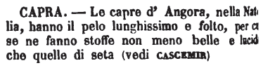 | Capra - Le capre d'Angora, nella Natolia, hanno il pelo lunghissimo e folto, per cui se ne fanno stoffe non meno belle e lucide che quelle di seta (vedi cascemir) [immagine] |