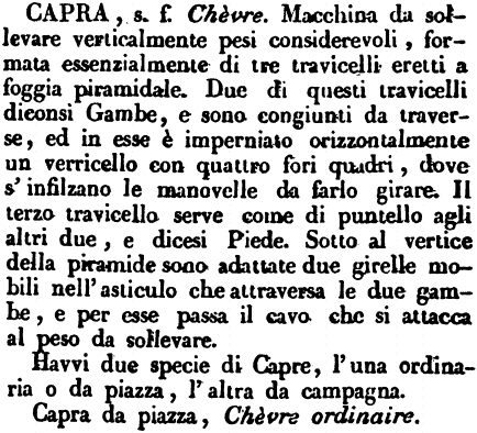 | Capra - s. f. Chèvre. Macchina da sollevare verticalmente pesi considerevoli, formata essenzialmente di tre travicelli eretti a foggia piramidale. Due di questi travicelli diconsi Gambe, e sono congiunti da traverse, ed in esse è imperniato orizzontalmente un verricello con quattro fori quadri, dove s'infilzano le manovelle per farlo girare. Il terzo travicello serve come di puntello agli altri due, e dicesi Piede. Sotto al vertice della piramide sono adattate due girelle mobili nell'asticulo che attraversa le due gambe, e per esse passa il cavo che si attacca al peso da sollevare.