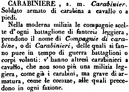 Nella moderna milizia le compagnie scelte d'ogni battaglione di fanteria leggiera, prendono il nome di Compagnie di carabine, o di Carabinieri, delle quali si fanno pure in tempo di guerra battaglioni o corpi volanti: v'hanno altresì carabinieri a cavallo, che non sono più una malizia leggiera, come già i carabini, ma grave di armatura, come le corazze, alle quali precedono in ogni fazione. [immagine] |