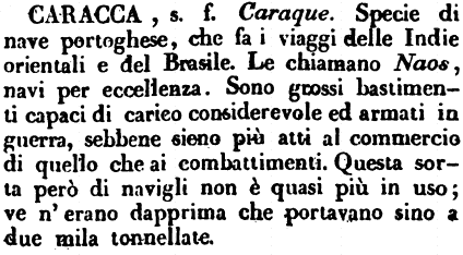 | Caracca - s. f. Caraque. Specie di nave portoghese, che fa i viaggi delle Indie orientali e del Brasile. Le chiamano Naos, navi per eccellenza. Sono grossi bastimenti capaci di carico considerevole ed armati in guerra, sebbene sieno più atti al commercio di quello che ai combattimenti. Questa sorta però di navigli non è quasi più in uso; ve n'erano dapprima che portavano sino a due mila tonnellate. [immagine] |