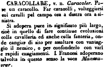 Caracollare - V. n. ass. Far caracolli. Salvin. F. B. 1. 2. 2. (Mt.) Caragollare, noi ora caracollare dallo Spagn. caracòl, chiocciola. [Val.] Ner. Sammin. 7. 18. Poi dalla parte, onde si sale al monte, Caracollar cento corazze miri. Pomp. Plut. 3. 34. La cavalleria… per non venire sgominata, costretta era di andar continuamente caracollando.