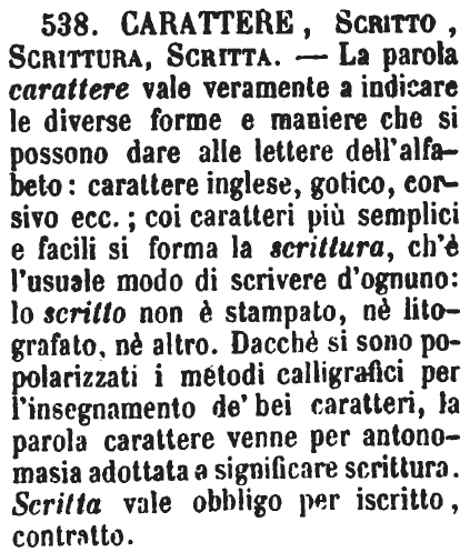 | Carattere, Scritto, Scrittura, Scritta - La parola carattere vale veramente a indicare le diverse forme e maniere che si possono dare alle lettere dell'alfabeto: carattere inglese, gotico, corsivo ecc.; coi caratteri più semplici e facili si forma la scrittura, ch'è l'usuale modo di scrivere d'ognuno: lo scritto non è stampato, nè litografato, nè altro. Dacchè si sono popolarizzati i metodi calligrafici per l'insegnamento de' bei caratteri, la parola carattere venne per antonomasia adottata a significare scrittura.
