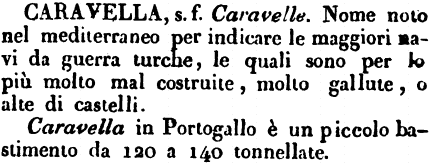 Caravella - s. f. Caravelle. Nome noto nel mediterraneo per indicare le maggiori navi da guerra turche, le quali sono per lo più molto mal costruite, molto gallute, o alte di castelli.