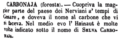 | Carbonaja (foresta) - Cuopriva la maggior parte del paese dei Nerviani a'tempi di Cesare, e doveva il nome al carbone che vi si faceva. Nel medio evo l'Hainaut è molte volte indicato sotto il nome di Selva Carbonaja. [immagine] |