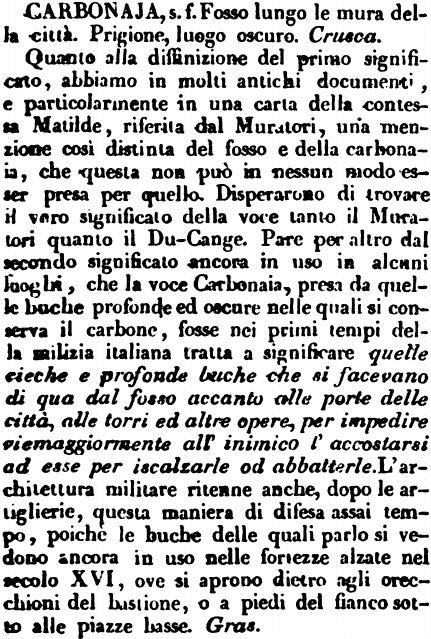 Carbonaja - s. f. Fosso lungo le mura della città. Prigione, luogo oscuro. Crusca.