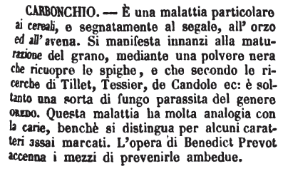 | Carbonchio - E' una malattia particolare ai cereali, e segnatamente al segale, all'orzo ed all'avena. Si manifesta innanzi alla maturazione del grano, mediante una polvere nera che ricuopre le spighe, e che secondo le ricerche di Tillet, Tessier, de Candole ec: è soltanto ua sorta di fungo parassita del genere oredo. Questa malattia ha molta analogia con la carie, benchè si distingua per alcuni caratteri assai marcati. L'opera di Benedict Prevot accenna i mezzi di prevenirle ambedue. [immagine] |