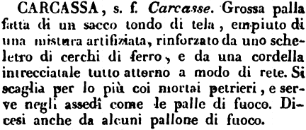 | Carcassa - s. f. Carcasse. Grossa palla fatta di un sacco tondo di tela, empiuto di una mistura artifiziata, rinforzato da uno scheletro di cerchi di ferro, e da una cordella intrecciatale tutto attorno a modo di rete. Si scaglia per lo più coi mortai petrieri, e serve negli assedi come le palle di fuoco. Dicesi anche da alcuni pallone di fuoco. [immagine] |