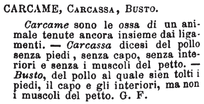 | Carcame, Carcassa, Busto - Carcame sono le ossa di un animale tenute ancora insieme dai ligamenti. - Carcassa dicesi del pollo senza piedi, senza capo, senza interiori e senza i muscoli del petto. - Busto, del pollo al quale sien tolti i piedi, il capo e gli interiori, ma non i muscoli del petto. G. F. [immagine] |