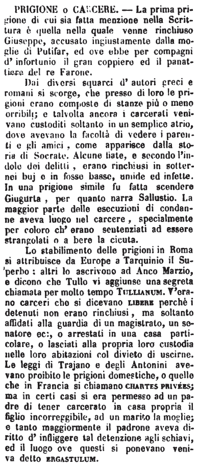 Lo stabilimento delle prigioni in Roma si attribuisce da Europe a Tarquinio il Superbo: altri lo ascrivono ad Anco Marzio, e dicono che Tullo vi aggiunse una segreta chiamata per molto tempo Tullianum. V'erano carceri che si dicevano libere perché i detenuti non erano rinchiusi, ma soltanto affidati alla guardia di un magistrato, un senatore ec:, o arrestati in una casa particolare, o lasciati alla propria loro custodia nelle loro abitazioni col divieto di uscirne. Le leggi di Trajano e degli Antonini avevano proibito le prigioni domestiche, o quelle che in Francia si chiamavano chartes privées; ma in certi casi si era permesso ad un padre di tener carcerato in casa propria il figlio incorreggibile, ad un marito la moglie; e tanto maggiormente il padrone aveva diritto d'infliggere tal detenzione agli schiavi, ed il luogo ove questi si ponevano veniva detto ergastulum. [immagine] |