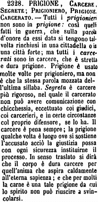 [Si scambiano spesso Carcere e Prigione; ma il primo dice qualcosa di più grave, ed è sempre a pena di colpa punibile dalle leggi dello Stato; il secondo è men grave, e può esser luogo di pena per colpe punite dalle leggi dello Stato e da quelle di privati. Nei collegi ci sono prigioni, non carceri, e cosi nelle caserme. Un bambino è messo dalla mamma in prigione dentro a uno stanzino bujo, e non in carcere. Talora è prigione anche un palazzo dal quale altri non possa uscire; né questo sarà mai carcere. E' meno improprio dir Prigione la Carcere, che Carcere la Prigione. — Ci sono, nel traslato, delle dolci prigioni e delle dolcissime prigionie; ma, nel proprio, c’ é il Carcere duro e il durissimo, e lo provò l'autore delle Mie prigioni. G.F.] [immagine] |