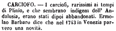 | Carciofo - I carciofi, rarissimi ai tempi di Plinio, e che sembrano indigeni dell'Andalusia, erano stati dipoi abbandonati. Ermolao Barbaro dice che nel 1743 in Venezia parvero una novità. [immagine] |