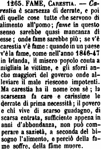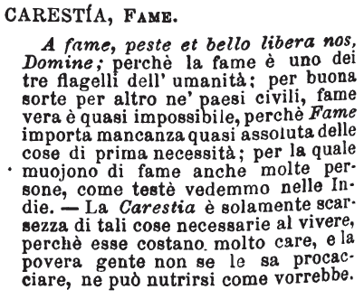 | Carestia, Fame - A fame, peste et bello libera nos, Domine; perchè la fame è uno dei tre flagelli dell'umanità; per buona sorte per altro ne' paesi civili, fame vera è quasi impossibile, perchè Fame importa mancanza quasi assoluta delle cose di prima necessità; per la quale muojono di fame anche molte persone, come testè vedemmo nelle Indie. - La Carestia è solamente scarsezza di tali cose necessarie al vivere, perchè esse costano molto care, e la povera gente non se le sa procacciare, ne può nutrirsi come vorrebbe. [immagine] |
