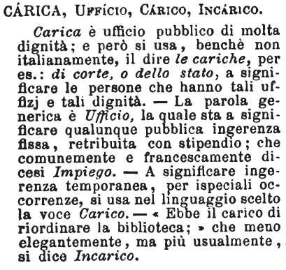 | Carica, Ufficio, Carico, Incarico - Carica è ufficio pubblico di molta dignità; e però si usa, benchè non italianamente, il dire le cariche, per es.: di corte, o dello stato, a significare le persone che hanno tali uffizj e tali dignità. - La parola generica è Ufficio, la quale sta a significare qualunque pubblica ingerenza fissa, retribuita con stipendio; che comunemente e francescamente dicesi Impiego. - A significare ingerenza temporanea, per ispeciali occorrenze, si usa nel linguaggio scelto la voce Carico. - «Ebbe il carico di riordinare la biblioteca;» che meno elegantemente, ma più usualmente, si dice Incarico. [immagine] |
