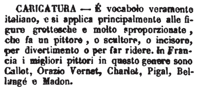 | Caricatura - E' vocabolo veramente italiano, e si applica principalmente alle figure grottesche e molto sproporzionate, che fa un pittore, o scultore, o incisore, per divertimento o per far ridere. In Francia i migliori pittori in questo genere sono Callot, Orazio Vernet, Charlet, Pigal, Bellangè e Madon. [immagine] |