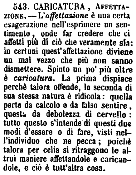 | Caricatura, Affettazione - L'affettazione è una certa esagerazione nell'esprimere un sentimento, onde far credere che ci affetti più di ciò che veramente sia: in certuni quest'affettazione diviene un mal vezzo che più non sanno dismettere. Spinto un po' più oltre è caricatura. La prima dispiace perchè talora offende, la seconda di sua stessa natura è ridicola: quella parte da calcolo o da falso sentire, questa da debolezza di cervello: tutto questo s'intende di questi due modi d'essere o di fare, visti nell'individuo che ne pecca; poichè talora per celia si ritraggono le altrui maniere affettandole e caricandole, e ciò è tutt'altra cosa. [immagine] |