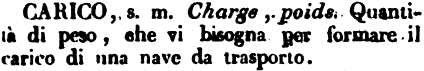 | Carico - s. m. Charge, poids. Quantità di peso, che vi bisogna per formare il carico di una nave da trasporto. [immagine] |