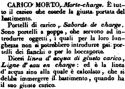| Carico morto - Morte-charge. È tutto il carico che eccede la giusta portata del bastimento.