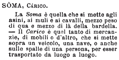 | Soma, Carico - La Soma è quella che si mette agli asini, ai muli e ai cavalli, mezzo peso di qua e mezzo di là della bardella. - Il Carico è quel tanto di mercanzie, di mobili o d'altro, che si mette sopra un veicolo, una nave, o anche sulle spalle di una persona, per esser trasportato da luogo a luogo. [immagine] |