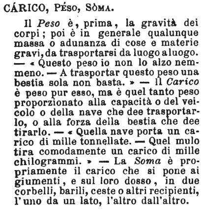 | Carico, Peso, Soma - Il Peso è, prima, la gravità dei corpi; poi è in generale qualunque massa o adunanza di cose e materie gravi, da trasportarsi da luogo a luogo. - «Questo peso io non lo alzo nemmeno. - A trasportar questo peso una bestia sola non basta.» - Il Carico è peso pur esso, ma è quel tanto peso proporzionato alla capacità o del veicolo o della nave che dee trasportarlo, o alla forza della bestia che dee tirarlo. - «Quella nave porta un carico di mille tonnellate. - Quel mulo tira comodamente un carico di mille chilogrammi.» - La Soma è propriamente il carico che si pone ai giumenti, e sul loro dosso, in due corbelli, barili, ceste o altri recipienti, l'uno da un lato, l'altro dall'altro. [immagine] |