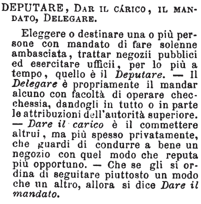 | Deputare, Dar il carico, Il mandato, Delegare - Eleggere o destinare una o più persone con mandato di fare solenne ambasciata, trattar negozii pubblici ed esercitare ufficii, per lo più a tempo, quello è il Deputare. - Il Delegare è propriamente il mandar alcuno con facoltà di operare checchessia, dandogli in tutto o in parte le attribuzioni dell'autorità superiore. - Dare il carico è il commettere altrui, ma più spesso privatamente, che guardi di condurre a bene un negozio con quel modo che reputa più opportuno. - Che se gli si ordina di seguitare piuttosto un modo che un altro, allora si dice Dare il mandato. [immagine] |