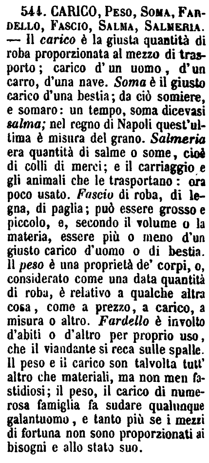 | Carico, Peso, Soma, Fardello, Fascio, Salma, Salmeria - Il carico è la giusta quantità di roba proporzionata al mezzo di trasporto; carico d'un uomo, d'un carro, d'una nave. Soma è il giusto carico d'una bestia; da ciò somiere, e somaro: un tempo, soma dicevasi salma; nel regno di Napoli quest'ultima è misura del grano. Salmeria era quantità di salme o some, cioè di colli di merci; e il carriaggio e gli animali che le trasportano: ora poco usato. Fascio di roba, di legna, di paglia; può essere grosso e piccolo, e, secondo il volume o la materia, essere più o meno d'un giusto carico d'uomo o di bestia. Il peso è una proprietà de' corpi, o, considerato come una data quantità di roba, è relativo a qualche altra cosa, come a prezzo, a carico, a misura o altro. Fardello è involto d'abiti o d'altro per proprio uso, che il viandante si reca sulle spalle. Il peso e il carico son talvolta tutt'altro che materiali, ma non men fastidiosi; il peso, il carico di numerosa famiglia fa sudare qualunque galantuomo, e tanto più se i mezzi di fortuna non sono proporzionati ai bisogni e allo stato suo. [immagine] |