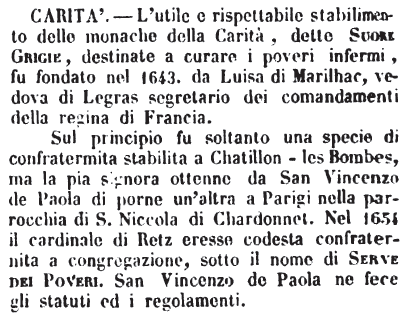 Sul principio fu soltanto una specie di confratermita stabilita a Chatillon - les Bombes, ma la pia signora ottenne da San Vincenzo de Paola di porne un'altra a Parigi nella parrocchia di S. Niccola di Chardonnet. Nel 1654 il cardinale di Retz eresse codesta confraternita a congregazione, sotto il nome di Serve dei Poveri. San Vincenzo de Paola ne fece gli statuti ed i regolamenti. [immagine] |