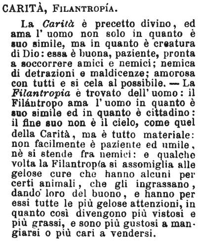 | Amore, Carità - Amore abbracciando più generi di cose, può esser buono o tristo, puro o turpe. La carità, semplice in sè, almeno nella direzione, è sempre cosa santa. Amore è sentimento; carità è opera. La carità non operosa è inutile e falsa. [immagine] |