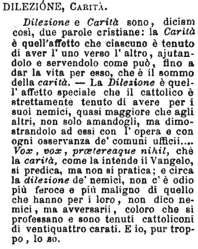 | Dilezione, Carità - Dilezione e Carità sono, diciam così, due parole cristiane: la Carità è quell'affetto che ciascuno è tenuto di aver l'uno verso l'altro, ajutandolo e servendolo come può, fino a dar la vita per esso, che è il sommo della carità. - La Dilezione è quell'affetto speciale che il cattolico è strettamente tenuto di avere per i suoi nemici, quasi maggiore che agli altri, non solo amandogli, ma dimostrandolo ad essi con l'opera e con ogni osservanza de' comuni ufficii.... Vox, vox, prætereaque nihil, chè la carità, come la intende il Vangelo, si predica, ma non si pratica; e circa la dilezione de' nemici, non c'è odio più feroce e più maligno di quello che hanno per i loro, non dico nemici, ma avversarii, coloro che si professano e sono tenuti cattoliconi di ventiquattro carati. E io, pur troppo, lo so. [immagine] |