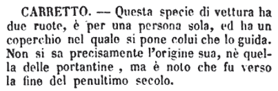 | Carretto - Questa specie di vettura ha due ruote, è per una persona sola, ed ha un coperchio nel quale si pone colui che lo guida. Non si sa precisamente l'origine sua, nè quella delle portantine, ma è noto che fu verso la fine del penultimo secolo. [immagine] |
