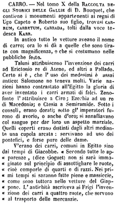 | Carro - Nel tomo X della Raccolta degli Storici delle Gallie di D. Bouquet, che contiene i monumenti appartenenti ai regni di Ugo Capeto e Roberto suo figlio, trovasi carrum, carretum, carrada, tolti dalla voce tedesca Karr.