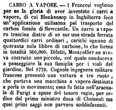 | Carro a vapore - I Francesi vogliono per se la gloria di aver inventato i carri a vapore, di cui Blenkensop in Inghilterra fece un'applicazione utilissima pel trasporto del carbon fossile di Newcastle. Un carro a vapore trascina dietro di se sur una strada ferrata quattordici carri ordinari, carichi ognuno di quaranta mila libbre di carbone, lo che forma in totalità 560,000. Difatti, Montgolfier ne aveva costruito uno piccolo, col quale conduceva a passeggiare la sua famiglia per i viali del giardino. Nel 1770. Cugnole ingegnere militare francese presentò una vettura a tre ruote, che portava una macchina a vapore destinata a porla in movimento; essa fu fatta nell'arsenale di Parigi a spese del tesoro regio, per ordine del primo ministro duca di Choiseul: ma quei primi saggi non parvero soddisfacenti. [immagine] |