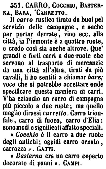 | Carro, Cocchio, Basterna, Bara, Carretto - Il carro rustico tirato da buoi pel servizio delle campagne, e anche per portar derrate, vino ecc. alla città, in Piemonte è a quattro ruote, e credo così sia anche altrove. Que' grandi e forti carri a due ruote che servono al trasporto di mercanzie da una città all'altra, tirati da più cavalli, li ho sentiti a chiamar bare; voce che si potrebbe accettare onde specificare questa maniera di carri. V'ha eziandio un carro di campagna più piccolo a due ruote; ma quello meglio dirassi carretto. Carro trionfale, carro di fuoco, carro d'Elia: sono modi e significati affatto speciali.