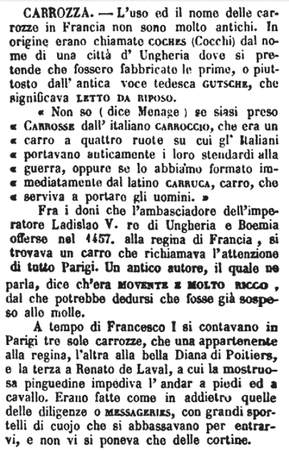 « Non so (dice Menage) se siasi preso carrosse dall'italiano carroccio, che era un carro a quattro ruote su cui gl'Italiani portavano anticamente i loro stendardi alla guerra, oppure se lo abbiamo formato immediatamente dal latino carruca, carro, che serviva a portare gli uomini. » Fra i doni che l'ambasciadore dell'imperatore Ladislao V. re di Ungheria e Boemia offerse nel 1457. alla regina di Francia, si trovava un carro che richiamava l'attenzione di tutto Parigi. Un antico autore, il quale ne parla, dice ch'era movente e molto ricco, dal che potrebbe dedursi che fosse già sospeso alle molle. A tempo di Francesco I si contavano in Parigi tre sole carrozze, che una appartenente alla regina, l'altra alla bella Diana di Poitiers, e la terza a Renato de Laval, a cui la mostruosa pinguedine impediva l'andar a piedi ed a cavallo. Erano fatte come in addietro quelle delle diligenze o messageries, con grandi sportelli di cuojo che si abbassavano per entrarvi, e non vi si poneva che delle cortine. [immagine] |