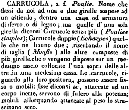 | Carrucola - s. f. Poulie. Nome che dassi da noi ad una o due girelle sospese ad un asticulo, dentro una cassa od armatura di ferro o di legno; ma quelle d'una sola girella diconsi Carrucole senza più (Poulies simples); Carrucole doppie (Echarpes) quelle che ne hanno due; riserbando il nome di taglia (Moufle) alle altre composte di più girelle che o vengono disposte sur un medesimo asse o collocate l'una sopra delle altre in una medesima cassa. Le carrucole, riguardo alla loro positura, possono essere fisse o mobili: fisse diconsi se, attaccate ad un corpo inerte, servono di fulcro alla potenza; mobili allorquando attaccate al peso lo strascinano seco. [immagine] |