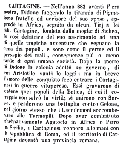 | Cartagine - Nell'anno 883 avanti l'era nostra, Didone fuggendo la tirannia di Pigmalione fratello ed uccisore del suo sposo, approdò in Africa, seguita da alcuni Tirj a lei fidi. Cartagine, fondata dalla moglie di Sicheo, fu così debitrice del suo nascimento ad una di quelle tragiche avventure che segnano la cuna dei popoli, e sono come il germe ed il presagio dei mali, conseguenze più o meno tarde di ogni umana società. Dopo la morte di Didone la colonia adottò un governo, di cui Aristotile vantò le leggi: ma in breve l'amore delle conquiste fece entrare i Cartaginesi in guerre vituperose. Essi gravarono di catene quei popoli della Betica, di cui il coraggio non salvò la virtù; si unirono con Serse, e perderono una battaglia contro Gelone, nel giorno stesso che i Lacedemoni soccombevano alle Termopili. Dopo aver combattuto alternativamente Agatocle in Africa e Pirro in Sicilia, i Cartaginesi vennero alle mani con la repubblica di Roma, ed il territorio di Cartagine doventò una provincia romana. [immagine] |