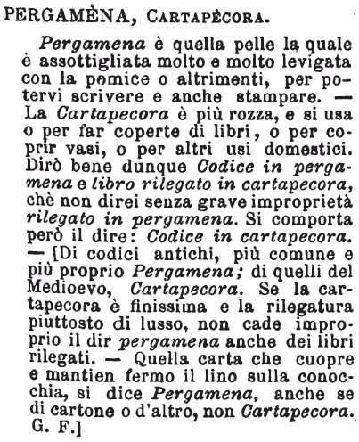 | Pergamena, Cartapecora - Pergamena è quella pelle la quale è assottigliata molto e molto levigata con la pomice o altrimenti, per potervi scrivere e anche stampare. - La Cartapecora è più rozza, e si usa o per far coperte di libri, o per coprir vasi, o per altri usi domestici. Dirò bene dunque Codice in pergamena e libro rilegato in cartapecora, chè non direi senza grave improprietà rilegato in pergamena. Si comporta però il dire: Codice in cartapecora. - [Di codici antichi, più comune e più proprio Pergamena; di quelli del Medioevo, Cartapecora. Se la cartapecora è finissima e la rilegatura piuttosto di lusso, non cade improprio il dir pergamena anche dei libri rilegati. - Quella carta che cuopre e mantien fermo il lino sulla conocchia, si dice Pergamena, anche se di cartone o d'altro, non Cartapecora. G. F.] [immagine] |