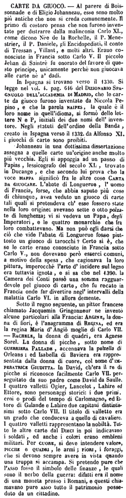 | Carte da giuoco - Al parere di Boissonnade e di Eligio Johanneau, esse sono molto più antiche che non si creda comunemente. Il primo di costoro pensa che non furono inventate per distrarre dalla malinconia Carlo XI., come dicono Nèe de la Rochelle, il P. Menestrier, il P. Daniele, gli Enciclopedisti, il conte di Tressan, Villant, e molti altri. Erano conosciute in Francia sotto Carlo V. Il piccolo Jehan di Saintrè fu onorato del favore di questo principe, unicamente perchè non giuocava alle carte nè a’ dadi.