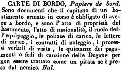 | Carte di bordo - Papiers de bord. Sono documenti che il capitano di un bastimento armato in corso è obbligato di avere a bordo, e sono l'atto di proprietà del bastimento, l'atto di nazionalità, il ruolo dell'equipaggio, le polizze di carico, le lettere di carico, i contratti di noleggio, i processi verbali di visita, le quietanze dei pagamenti o fedi di cauzione delle Dogane per non essere trattato come un pirata se è preso dal nemico. Bal. [immagine] |