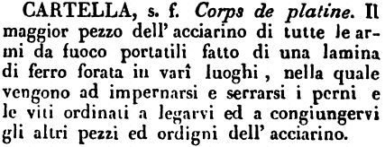 | Cartella - s. f. Corps de platine. Il maggior pezzo dell'acciarino di tutte le armi da fuoco portatili fatto di una lamina di ferro forata in vari luoghi, nella quale vengono ad impernarsi e serrarsi i perni e le viti ordinati a legarvi ed a congiungervi gli altri pezzi ed ordigni dell'acciarino. [immagine] |