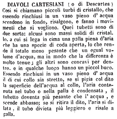 | Diavoli cartesiani (o di Descartes) - Così si chiamano piccoli turbi di cristallo, che essendo rinchiusi in un vaso pieno d'acqua scendono in fondo, risalgono, e fanno i movimenti che si vogliono. Quei tubetti sono di due sorta: alcuni sono massi solidi di cristallo, a cui si lega in cima una palla piena d'aria che ha una specie di coda aperta, lo che rende il totale meno pesante che un egual volume d'acqua, ma in modo che la differenza è molto tenue; gli altri sono concavi per dentro, e in qualche luogo hanno un piccol buco. Essendo rinchiusi in un vaso pieno d'acqua il di cui collo sia stretto, se si pigia col dito la superficie dell'acqua al collo, l'aria contenuta nel tubo o nella palla è condensata, il tubetto doventa più pesante che l'acqua, e scende abbasso; se si ritira il dito, l'aria si dilata, il tubo divieta più leggiero e risale a galla. [immagine] |