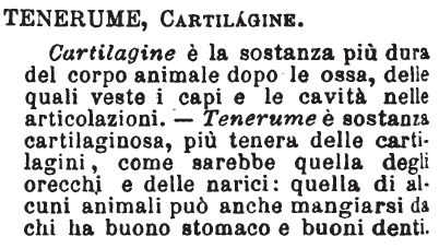 | Tenerume, Cartilagine - Cartilagine è la sostanza più dura del corpo animale dopo le ossa, delle quali veste i capi e le cavità nelle articolazioni. - Tenerume è sostanza cartilaginosa, più tenera delle cartilagini, come sarebbe quella degli orecchi e delle narici: quella di alcuni animali può anche mangiarsi da chi ha buono stomaco e buoni denti. [immagine] |