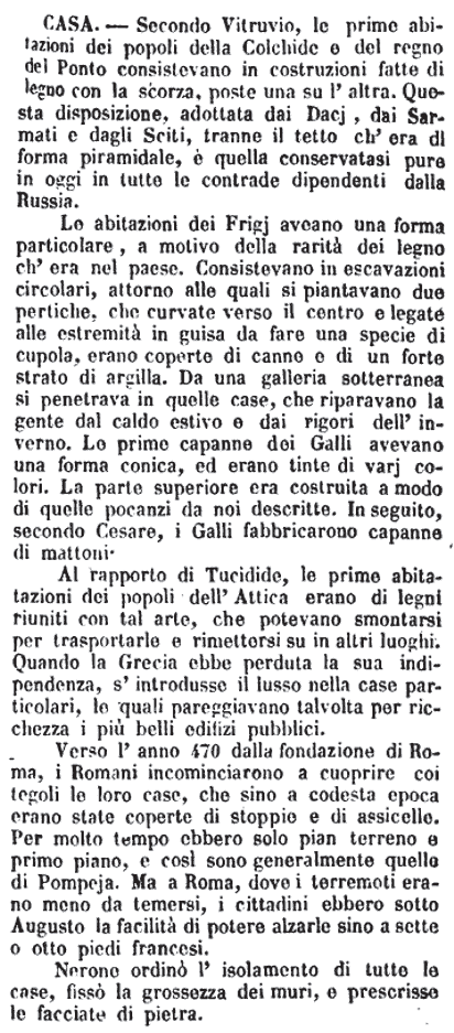 Casa - Secondo Vitruvio, le prime abitazioni dei popoli della Colchide e del regno del Ponto consistevano in costruzioni fatte di legno con la scorza, poste una su l'altra. Questa disposizione, adottata dai Dacj, dai Sarmati e dagli Sciti, tranne il tetto ch'era di forma piramidale, è quella conservatasi pure in oggi in tutte le contrade dipendenti dalla Russia.