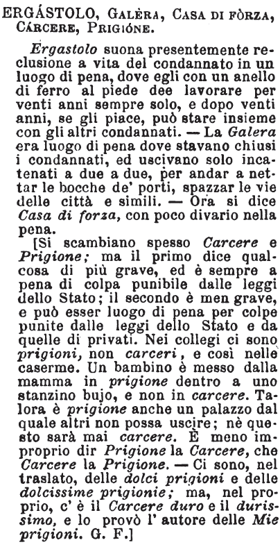 Ergastolo, Galera, Casa di forza, Carcere, Prigione - Ergastolo suona presentemente reclusione a vita del condannato in un luogo di pena, dove egli con un anello di ferro al piede dee lavorare per venti anni sempre solo, e dopo venti anni, se gli piace, può stare insieme con gli altri condannati. — La Galera era luogo di pena dove stavano chiusi i condannati, ed uscivano solo incatenati a due a due, per andar a nettar le bocche de' porti, spazzar le vie delle città e simili. — Ora si dice Casa di forza, con poco divario nella pena.