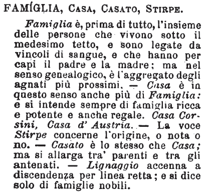 Famiglia, Casa, Casato, Stirpe - Famiglia è, prima di tutto, l'insieme delle persone che vivono sotto il medesimo tetto, e sono legate da vincoli di sangue, e che hanno per capi il padre e la madre; ma nel senso genealogico, è l'aggregato degli agnati più prossimi. - Casa è in questo senso anche più di Famiglia: e si intende sempre di famiglia ricca e potente e anche regale. Casa Corsini, Casa d'Austria. - La voce Stirpe concerne l'origine, o nota o no. - Casato è lo stesso che Casa; ma si allarga tra' parenti e tra gli antenati. - Lingnaggio accenna a discendenza per linea retta; e si dice solo di famiglie nobili. [immagine]